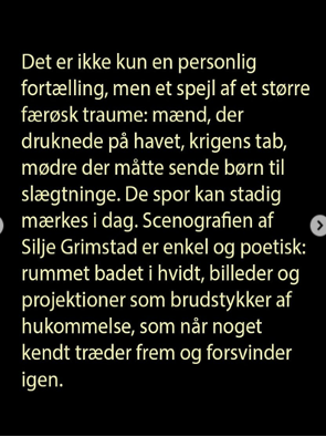 ”Sorgarsøgan um vanlukkuna í Hesti er ikki bert ein familju søga, men ein alheims frásøgn um lívstreytir og samleika. Okkara "Upphav". Takk Tvazz og Leikhús SKIFT fyri eina leiklistaliga perlu.